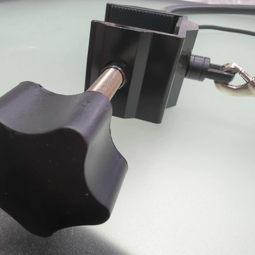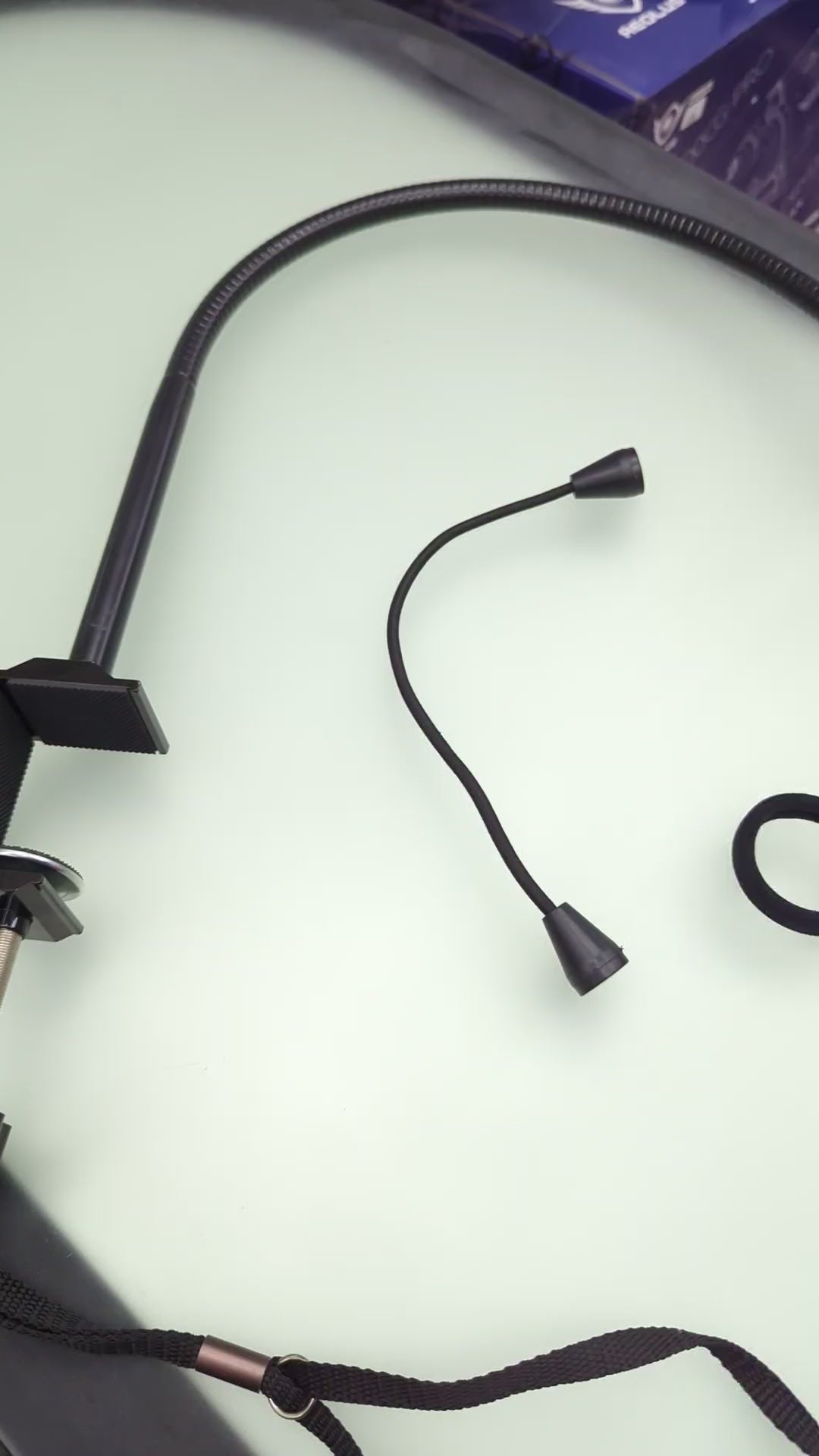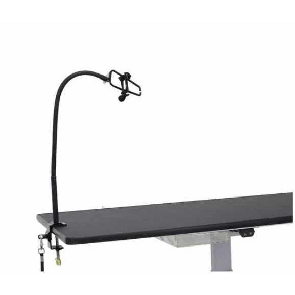 The trick is in the stretchy nylon that wraps around your hose and traps it. no clamps to slip, break and loose grip. Comes with a sturdy table clamp, no crappy plastic thing that slides off. Bend arm to any position you need.