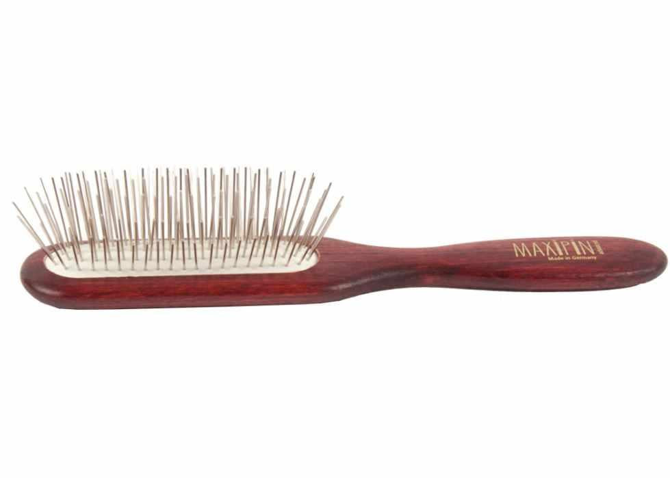 These wooden handled pin brushes are quality made in Germany. With extra long metal pins mounted in a supple rubber pad, these brushes are recommended for long show coats, allowing thorough brushing without damaging the coat.