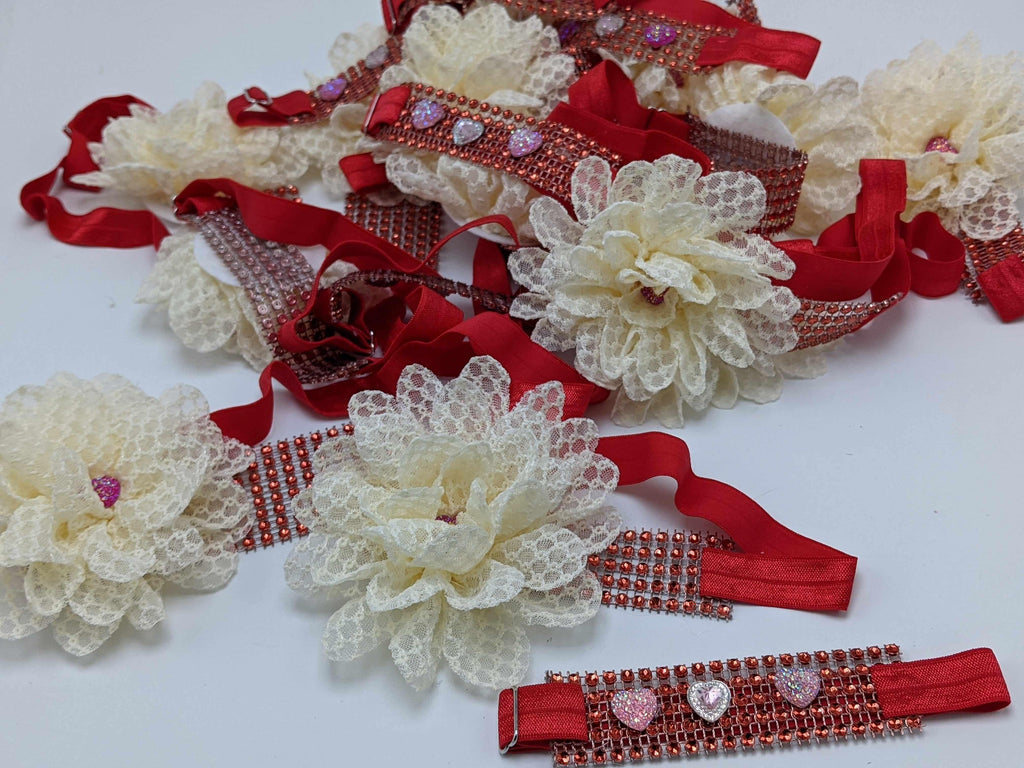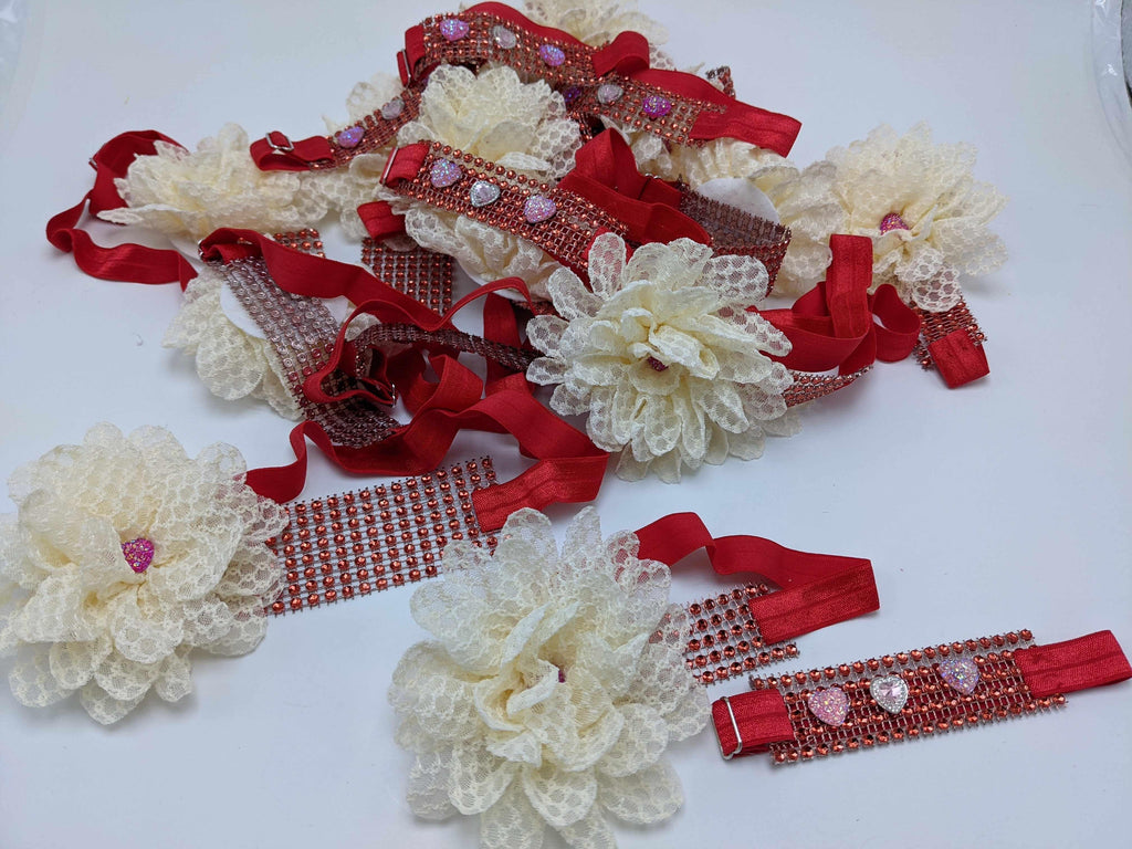 Enveloppement scintillant scintillant sur un ruban élastique extensible brillant dans des couleurs coordonnées dans des tailles réglables prêtes à l'emploi pour tous vos chats et chiens, du jouet au dogue. avec des fleurs coordonnées avec des centres de pierres précieuses. Très confortable, les chats ne s'en soucient pas du tout. Les chiens qui détestent les décorations leur conviennent. Comprend des curseurs réglables pour les dimensionner pour chaque chien et chat.