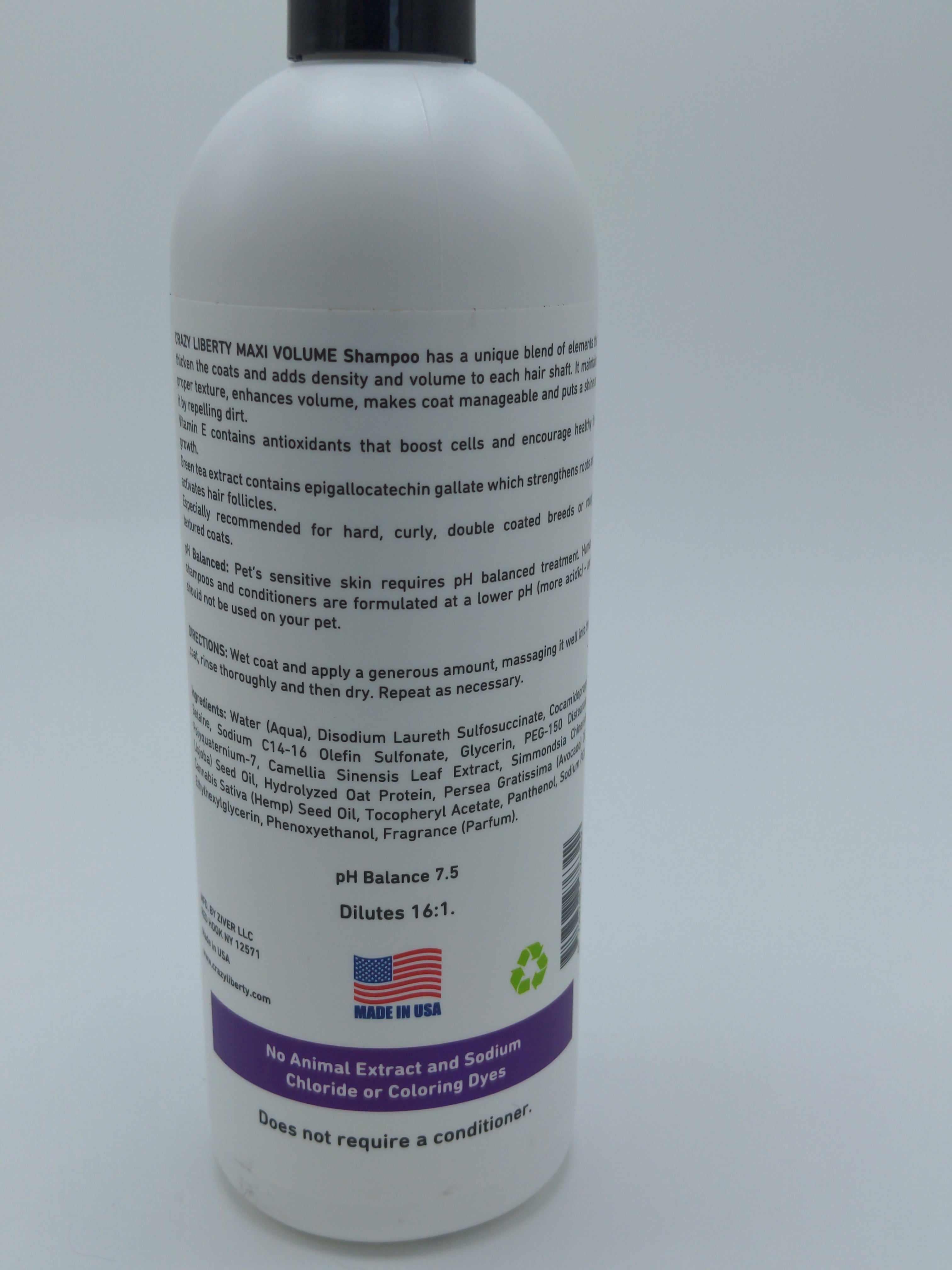 Shampoing CRAZY LIBERTY MAXI VOLUME a un mélange unique d'éléments qui épaississent les poils et ajoutent de la densité et du volume à chaque tige capillaire. Il maintient une texture appropriée, améliore le volume, rend le pelage maniable et lui donne de la brillance en repoussant la saleté.