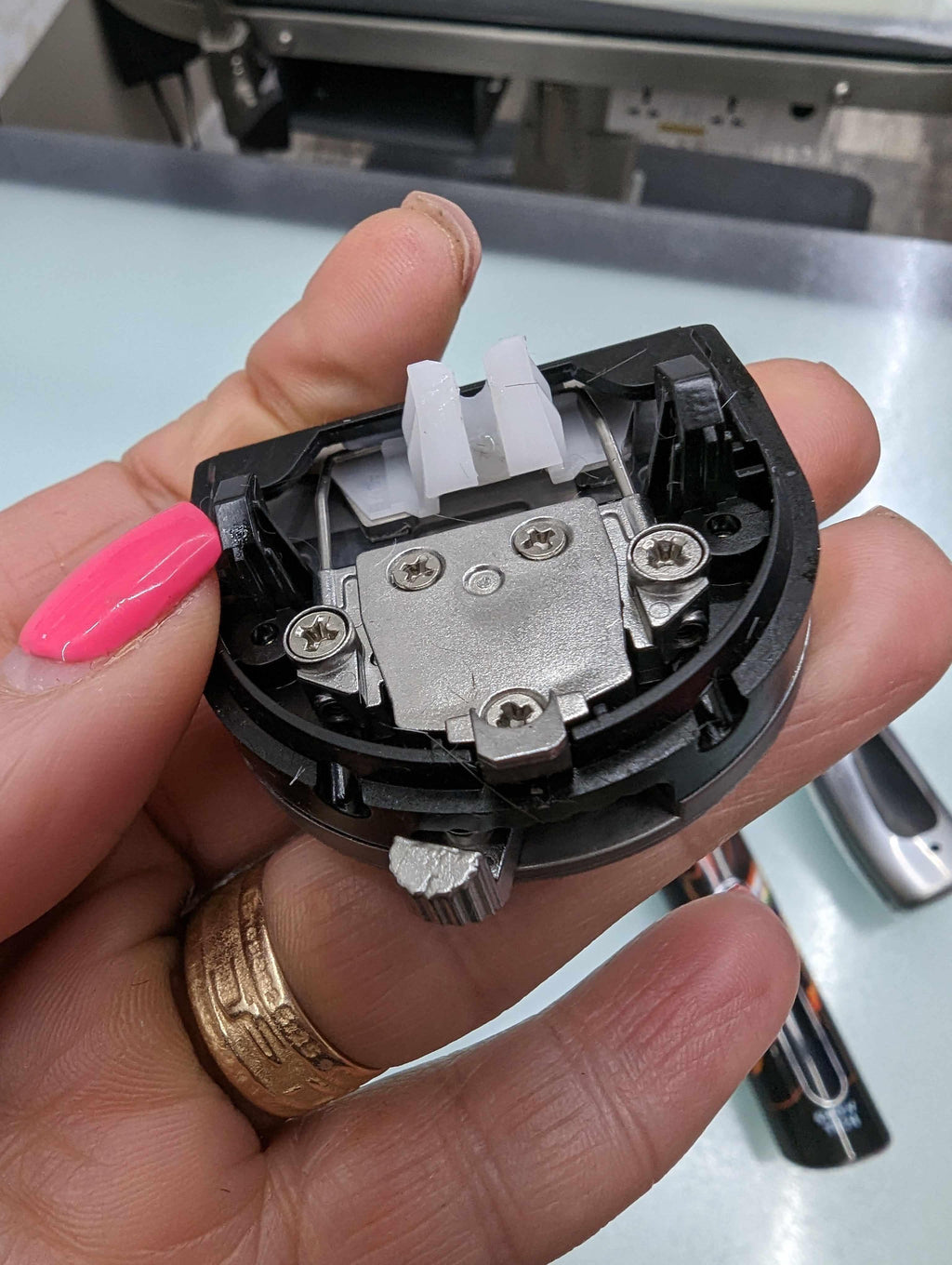 Tenez la tondeuse face vers le haut avec une main et appuyez sur les dents en haut de la lame à l'aide de votre pouce jusqu'à ce que la lame soit décollée. Tendez votre autre main et utilisez-la pour attraper la lame et éviter de la faire tomber.