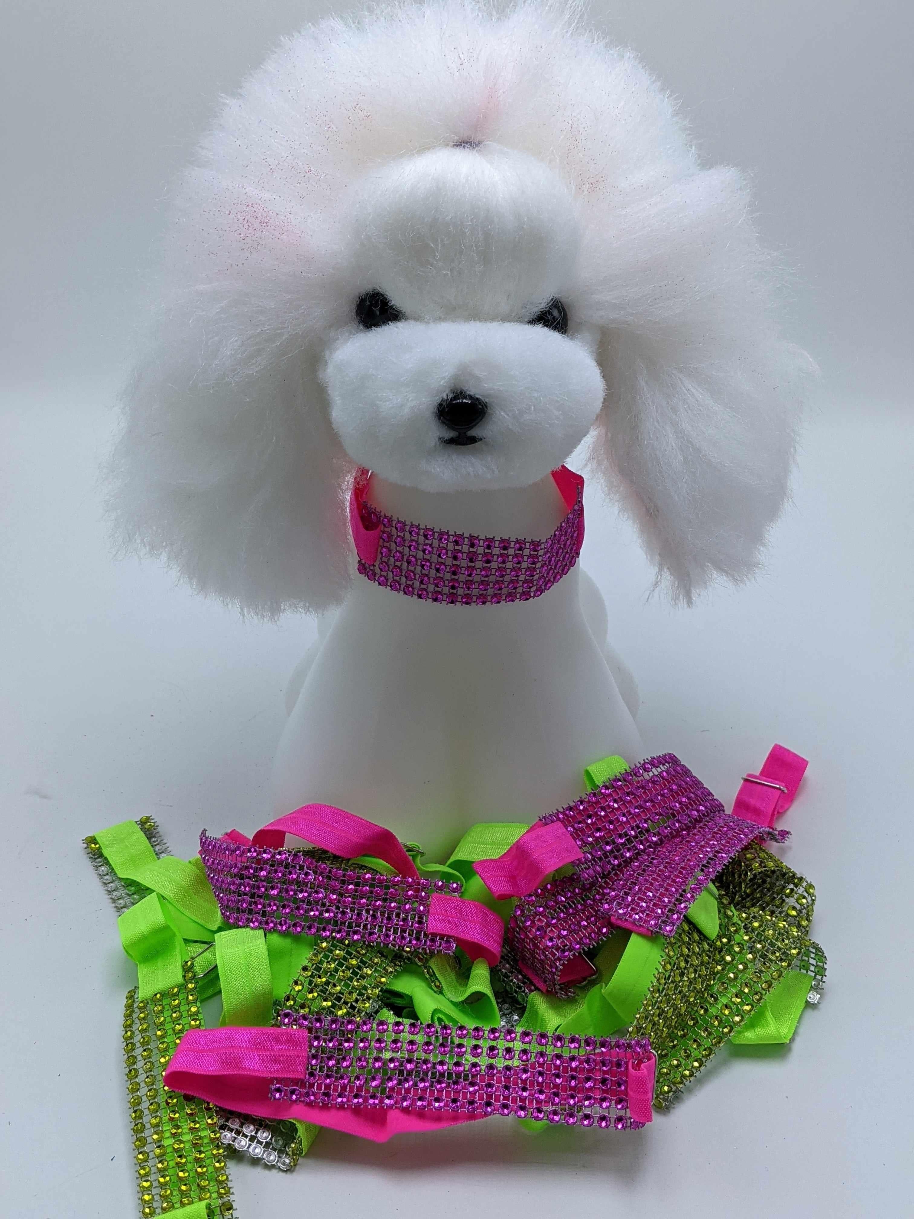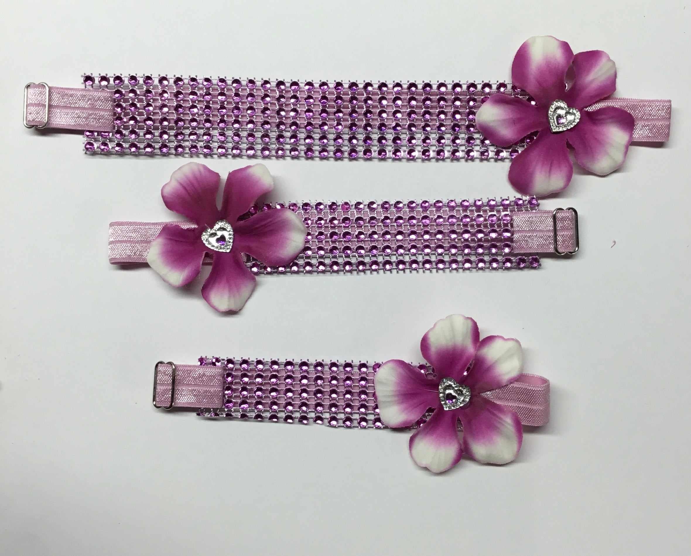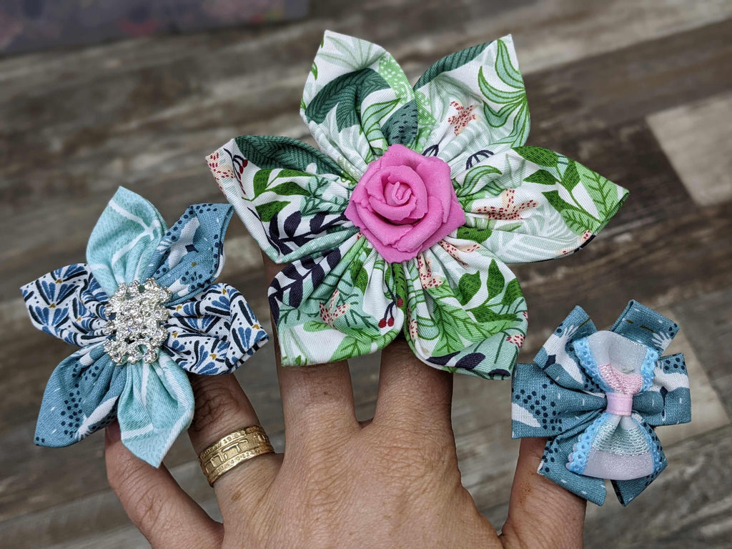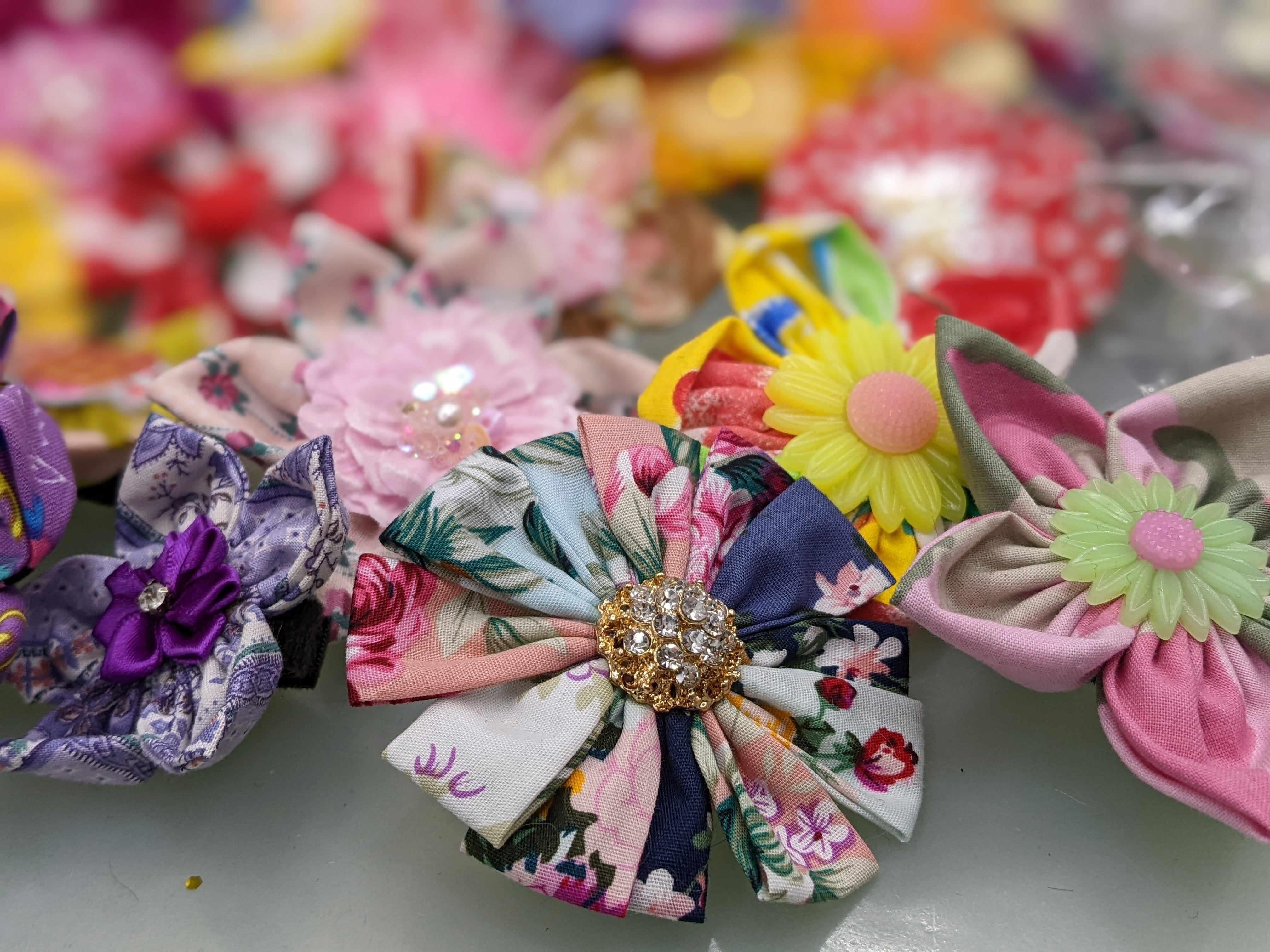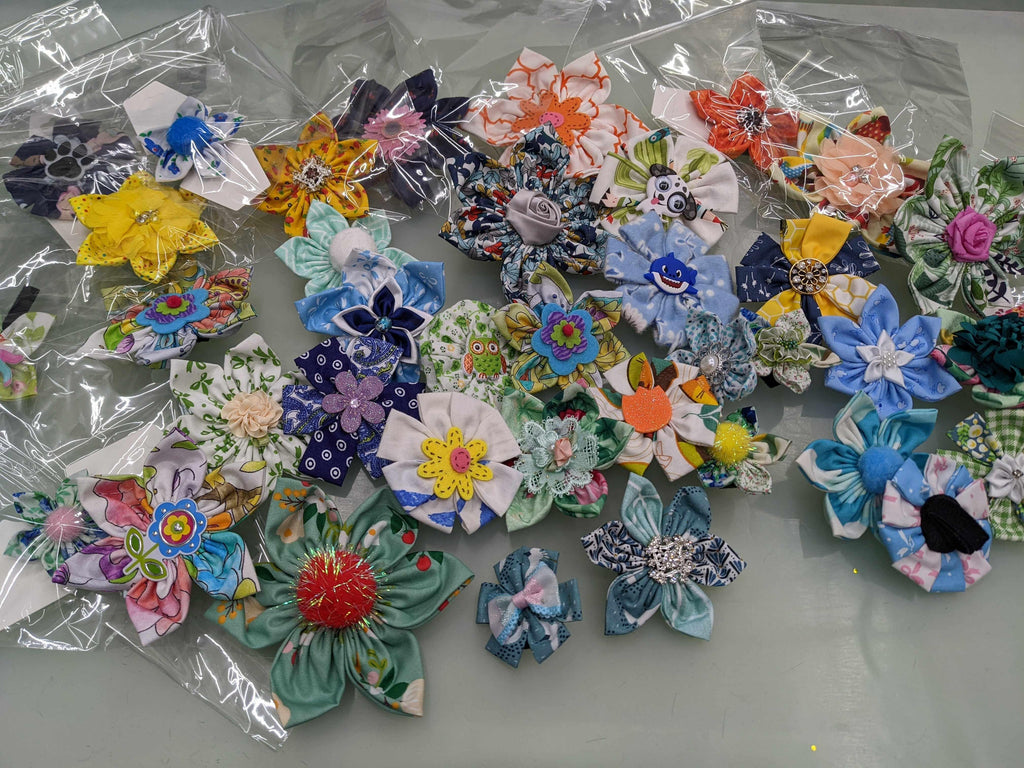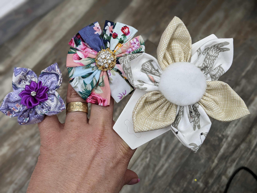 Les fleurs sont comme une fleur, avec des « pétales » de tissu, parfois enroulés, parfois alternés. Certains ont des embellissements. Pas deux sont les mêmes! S'adapte à chaque collier ou harnais avec une sangle velcro réutilisable.