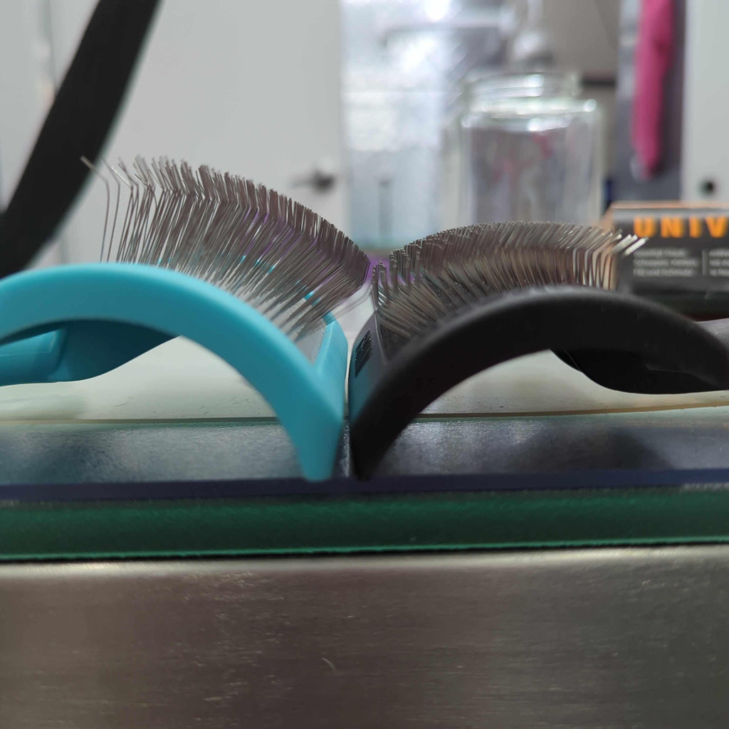 Poils raides - Brosser dans le sens de la pousse du poil, puis contre celui-ci si nécessaire pour éliminer les nattes et les poils morts. Si le pelage est emmêlé, utilisez cette brosse plus lisse en combinaison avec le peigne démêlant Show Tech Mat Buster .
