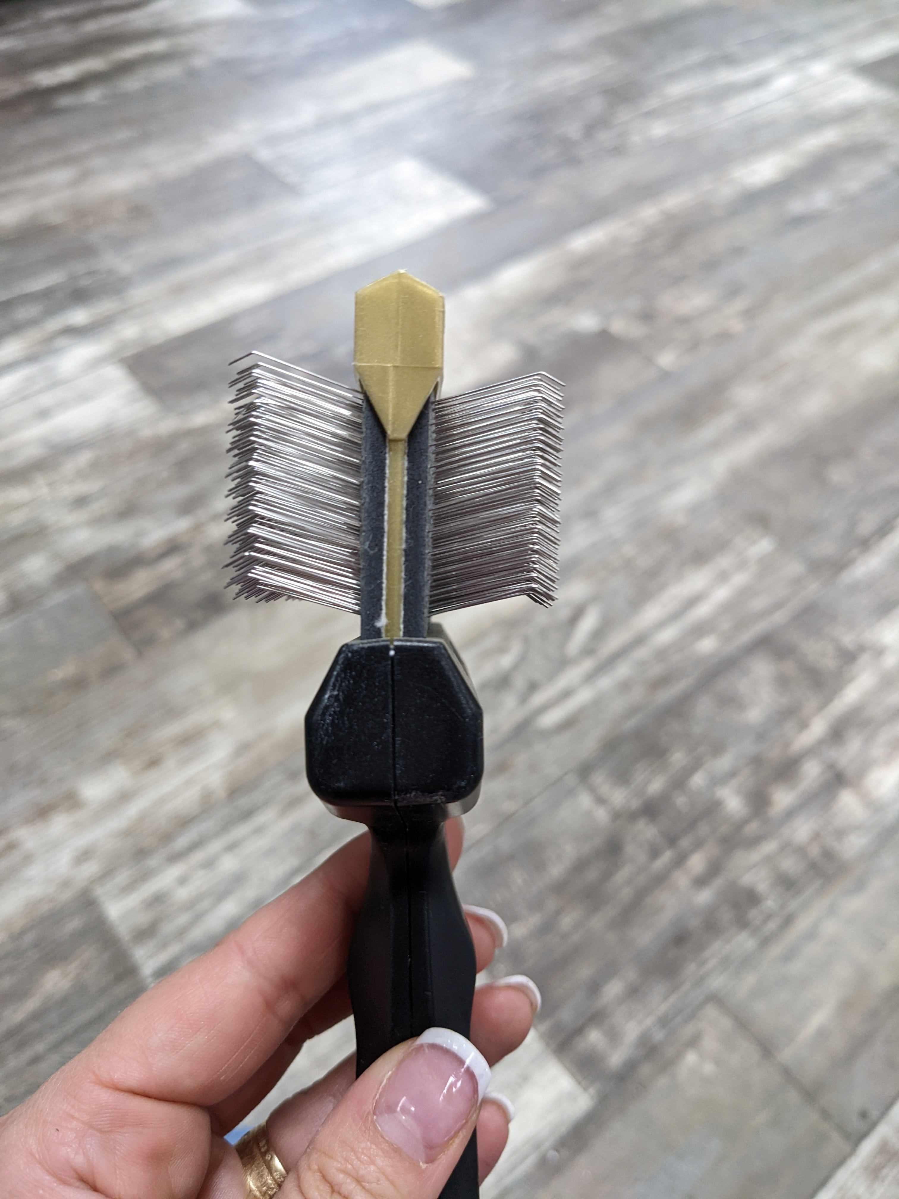 **c'est Joannes qu'on va quotidiennement pour "taper" les nattes dans les queues, les oreilles de petites races moelleuses comme le shih tzu, le yorkshire, etc., le large est idéal pour éliminer tous les enchevêtrements de gribouillages, etc.