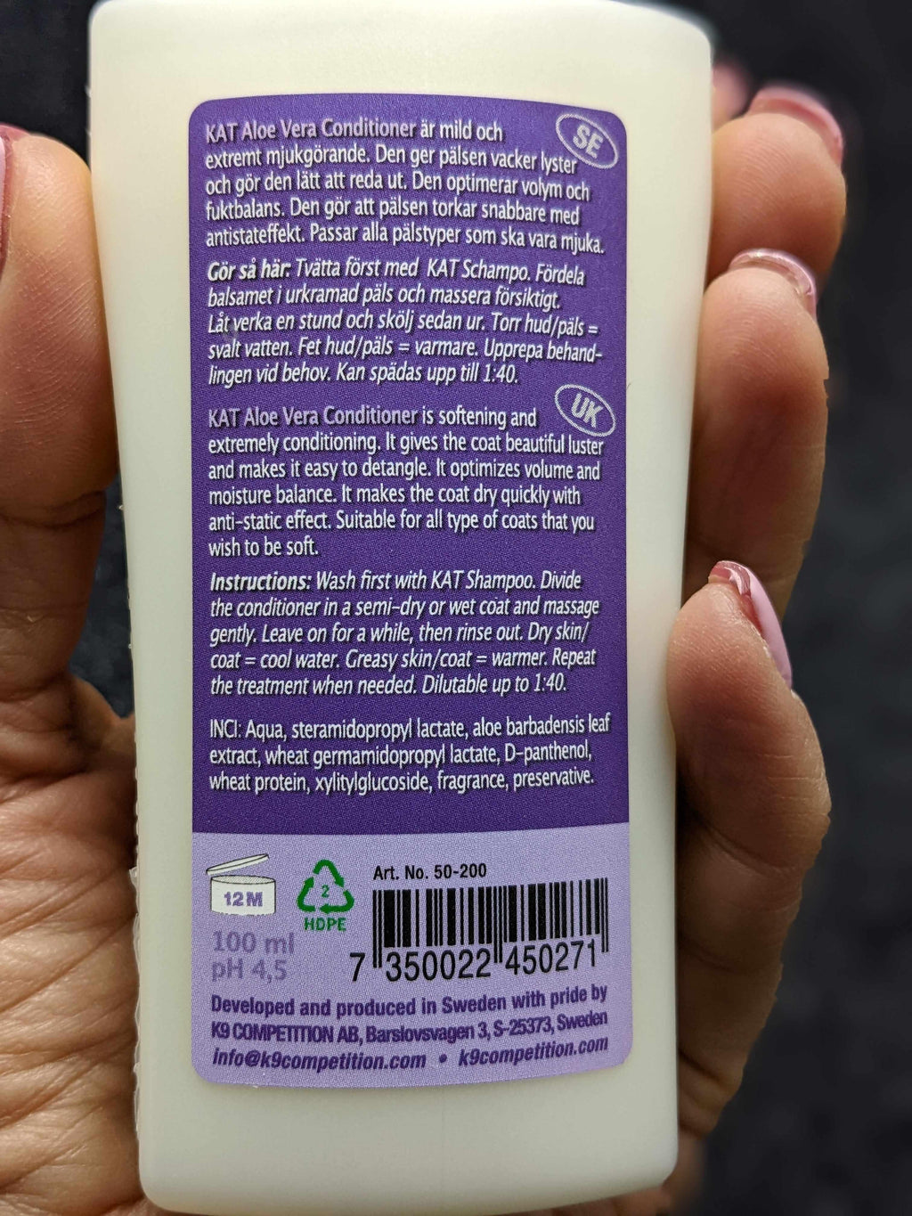 Mode d'emploi : Commencez par laver avec K9 KAT SHAMPOO. Appliquez l'après-shampooing sur le pelage essoré et massez doucement. Laissez agir un instant puis rincez. Peau/poil sec = eau fraîche. Gras = plus chaud. Répétez le traitement. Peut être dilué jusqu'à 1:40.
