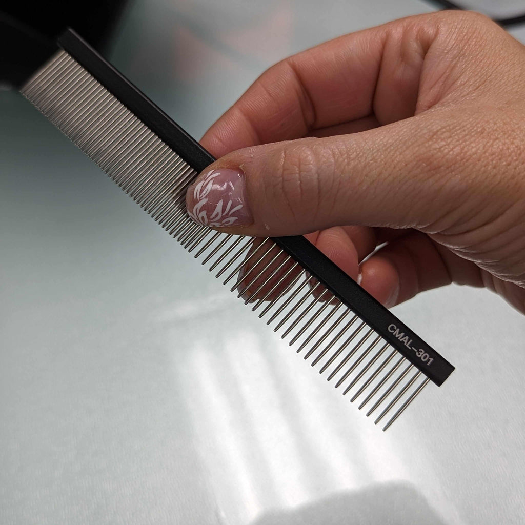 Ces peignes sont légers, avec une poignée en alliage d'aluminium et des dents légèrement plus épaisses que les peignes à ciseaux, ce qui signifie qu'ils peluchent parfaitement, ne tirent pas et sont plus solides que les peignes à ciseaux à dents fines.