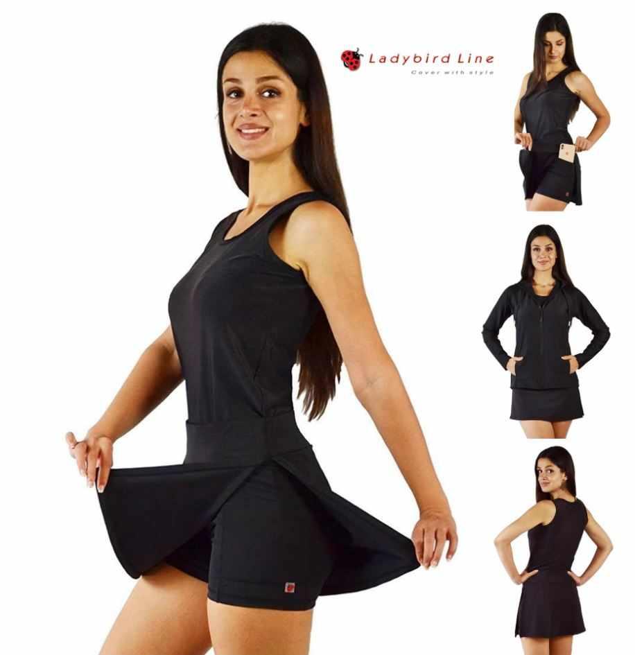 des photos montrant le débardeur Shadow associé à la jupe-short Shadow anti-cheveux en noir,