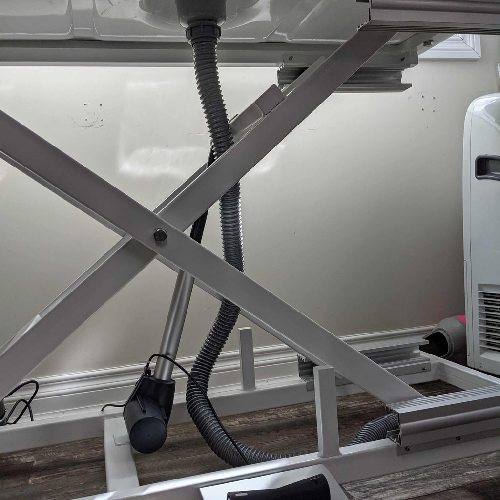 -The sturdy base and electric lift system easily support more than 260lbs. The tub lowers to within  18 " of the ground(from the bottom of door lip), making it a stroll for large breeds and older dogs to enter and depart the tub.