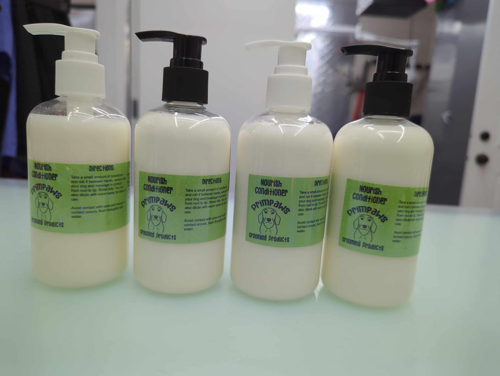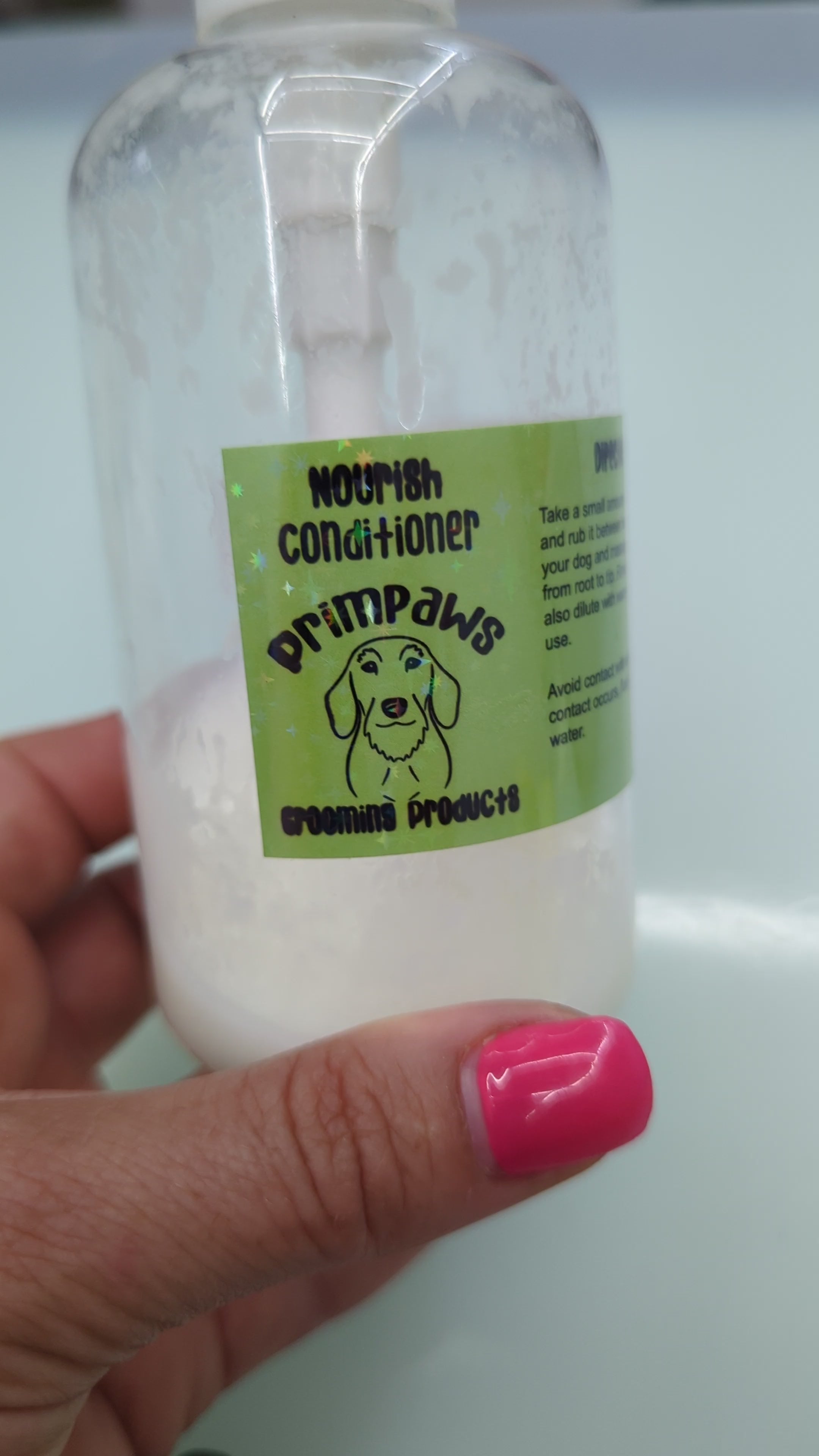 We make our amazing conditioner from scratch from only the finest gentle and skin safe ingredients. Take a small amount and then spread it on your dog's coat. You can also dilute it with warm water (shake well!). Nourish will soften, smooth, detangle, and help release shedding coat. Coats will be bouncier and fuller after using this amazing product.