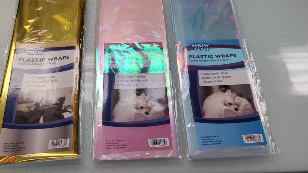 Pour réaliser des wraps vous aurez besoin, en plus de ce matériel d'emballage spécial (films plastiques), d'huile, d'un un peigne à aiguilles , une brosse et des élastiques. Nous vous recommandons de laver le pelage au moins une fois par semaine, d'utiliser un après-shampooing nourrissant ou un masque capillaire et de traiter le pelage une à deux fois par semaine avec Huile de pelage hydratante Show Tech+ pour entretenir le pelage et lui redonner son équilibre naturel. Vous pouvez appliquer l'huile la veille d'un lavage, juste après un lavage ou en milieu de semaine entre les lavages. La meilleure façon d'appliquer l'huile est expliquée dans ce article de blog (sous « Nettoyé mais pas suffisamment nourri »).