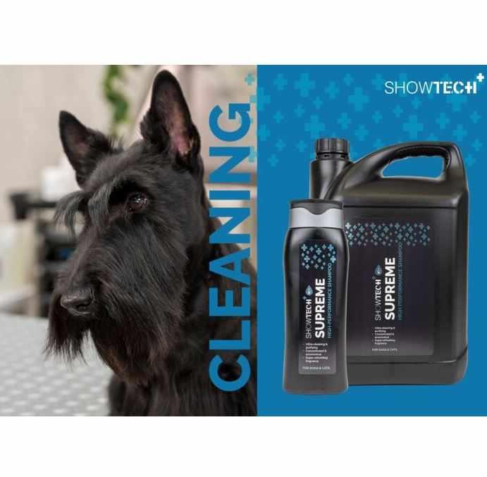 The Show Tech+ Supreme Shampoo is a purifying, multifunctional and very economical shampoo. Super concentrated (1/20), this shampoo ensures that the skin is thoroughly cleansed without drying out the coat. It removes all traces of sebum, oil, dirt and grease from your dog’s or cat’s skin and hair. This way, the coat is completely ready for the next steps: a treatment with another shampoo or a conditioner from our Show Tech+ range.
