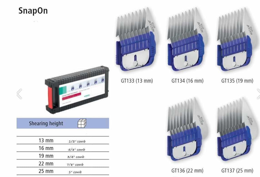 Set GT130 consists of 5 clip-on combs in plastic reusable carry case.