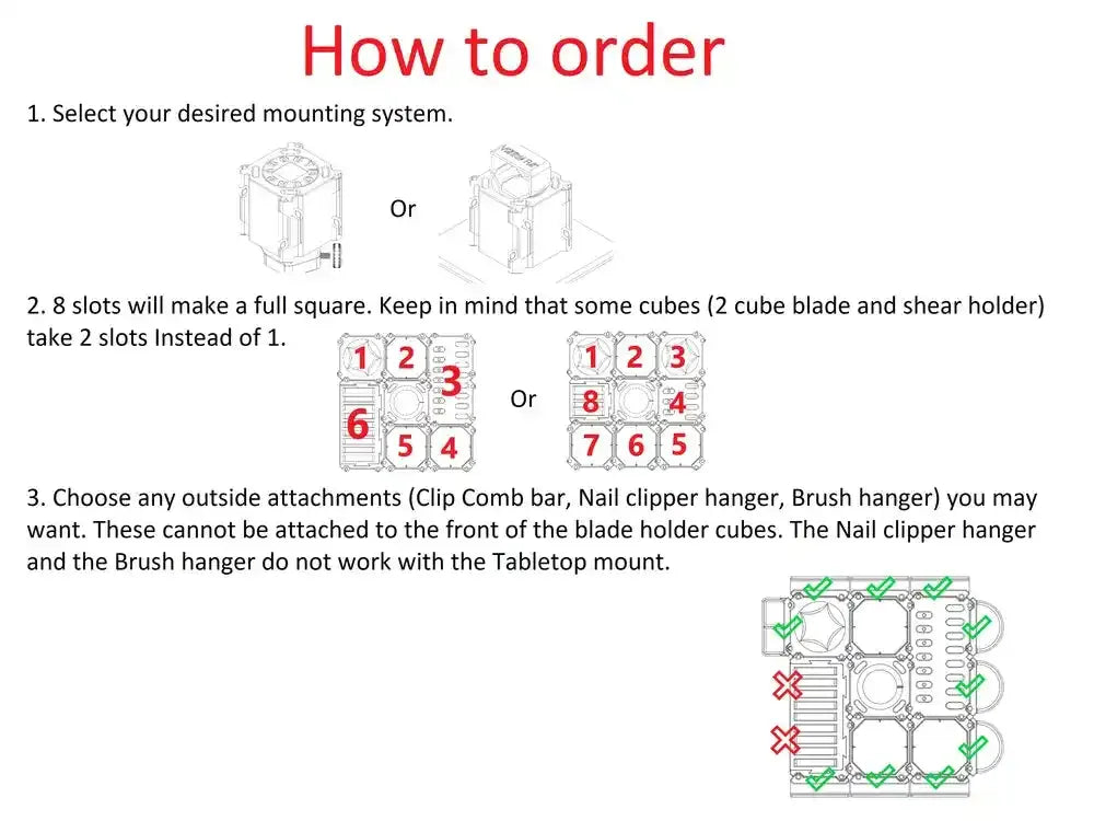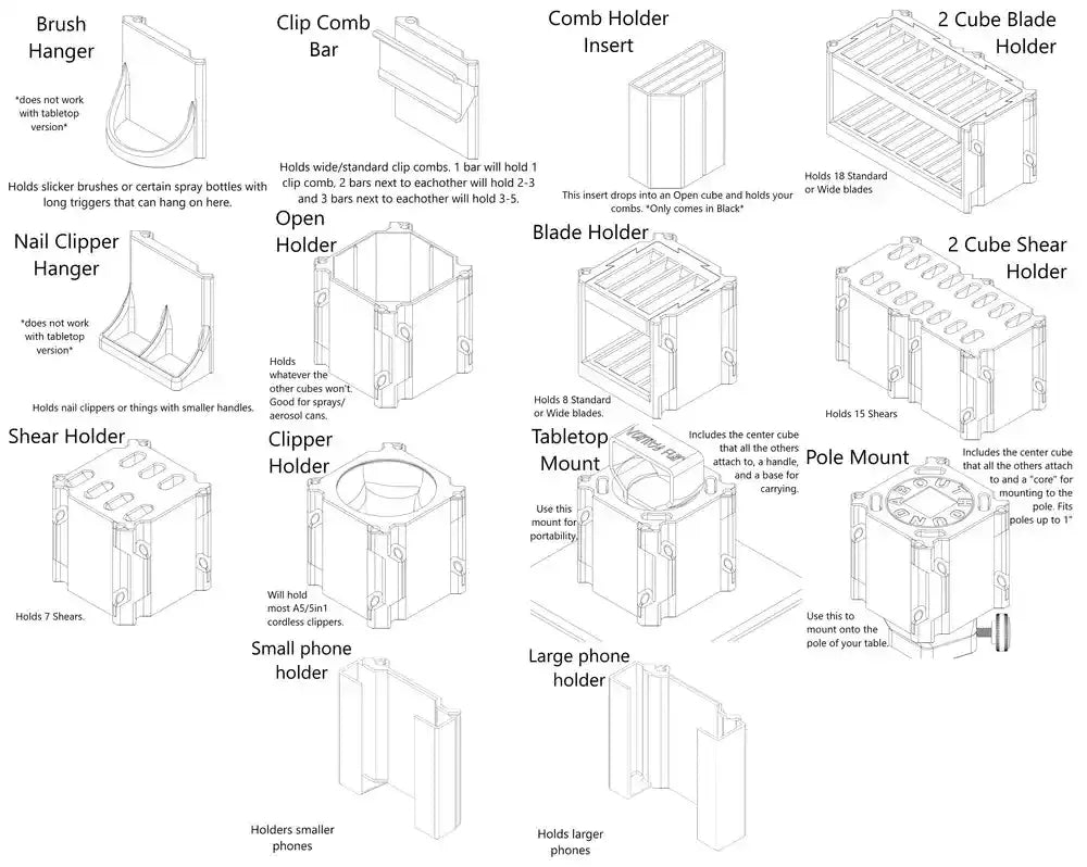 We have a cordless clipper holder, comb holder insert, blade holder, open holder, shear holder, brush hanger, nail clipper hanger, clip comb bar, and more!