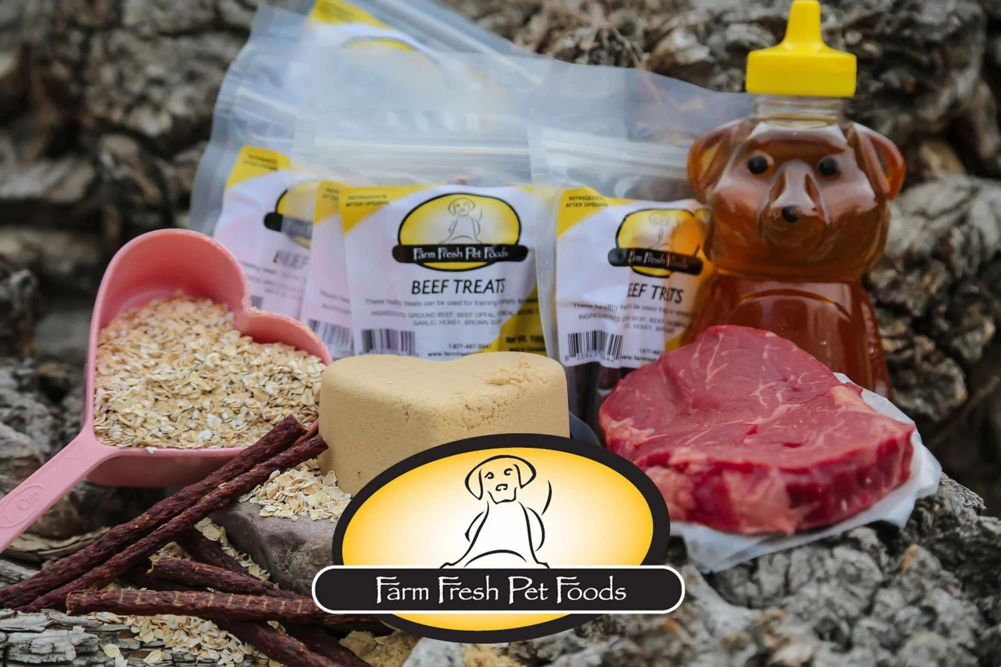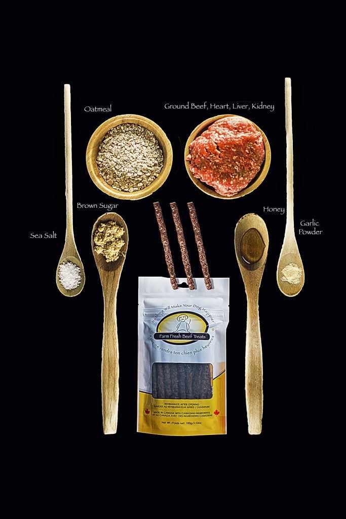 Beef Treats are made with ground beef, beef liver, kidney and heart, oatmeal, garlic powder, sea salt, liquid honey and a small amount of brown sugar to bind the treat together. They break apart nicely to be used for training or can be given whole for a special treat.