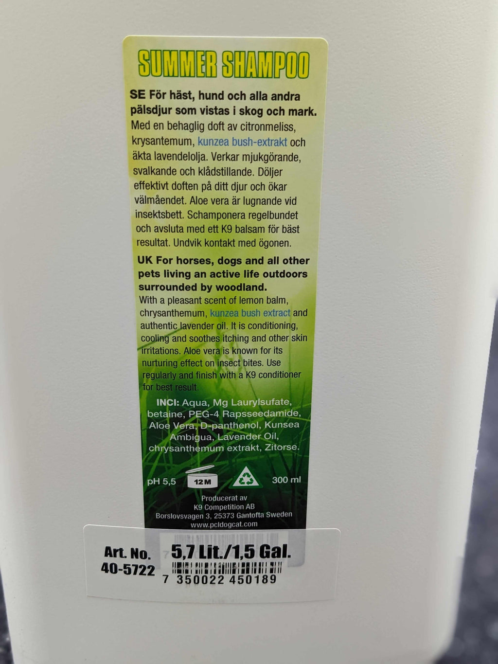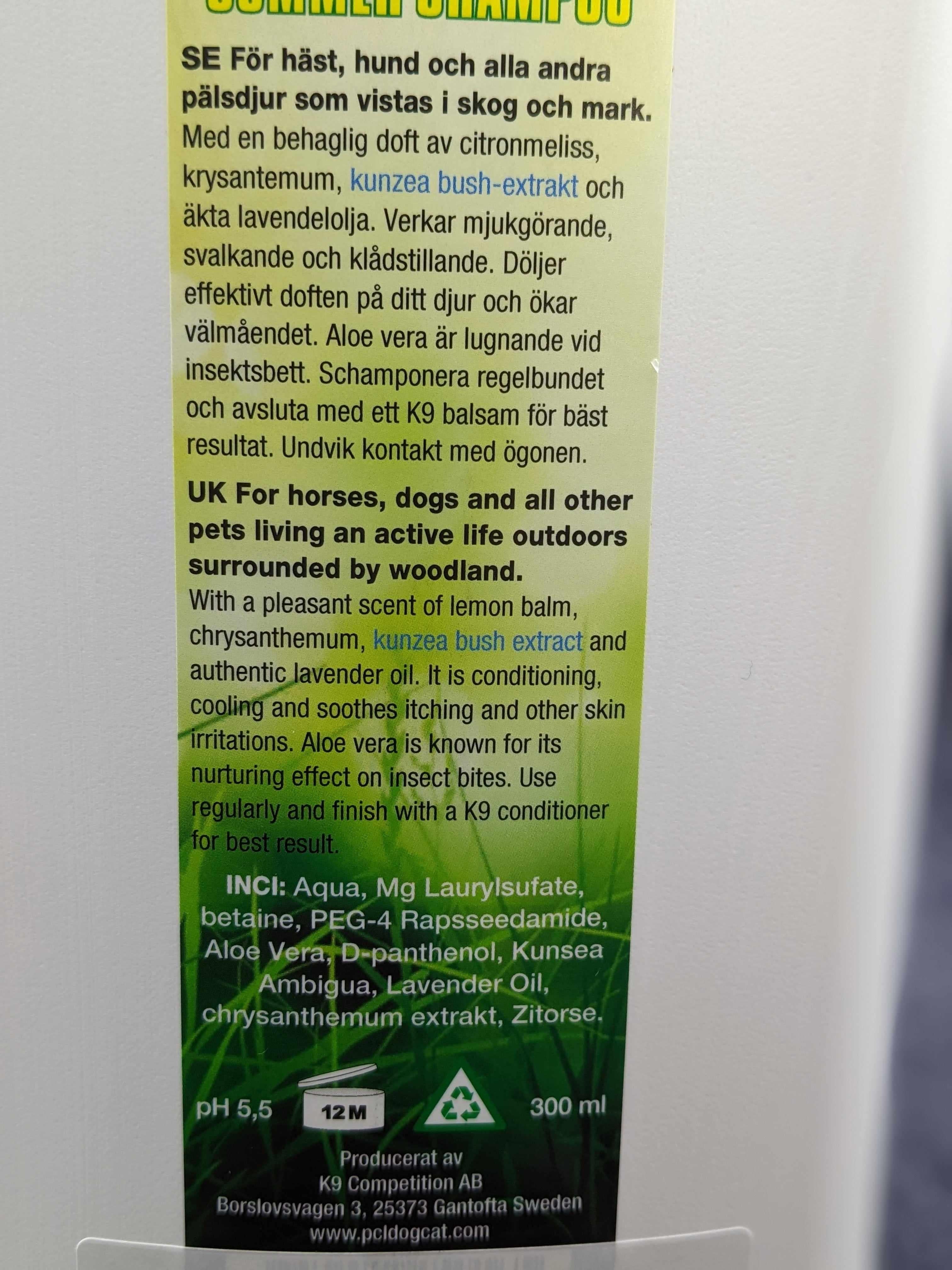 A summer shampoo for dogs, cats, horses and other fur animals that live in forests and fields. Has a pleasant aroma of lemon balm, chrysanthemum, Kunzea Bush extract and genuine Lavender oil.