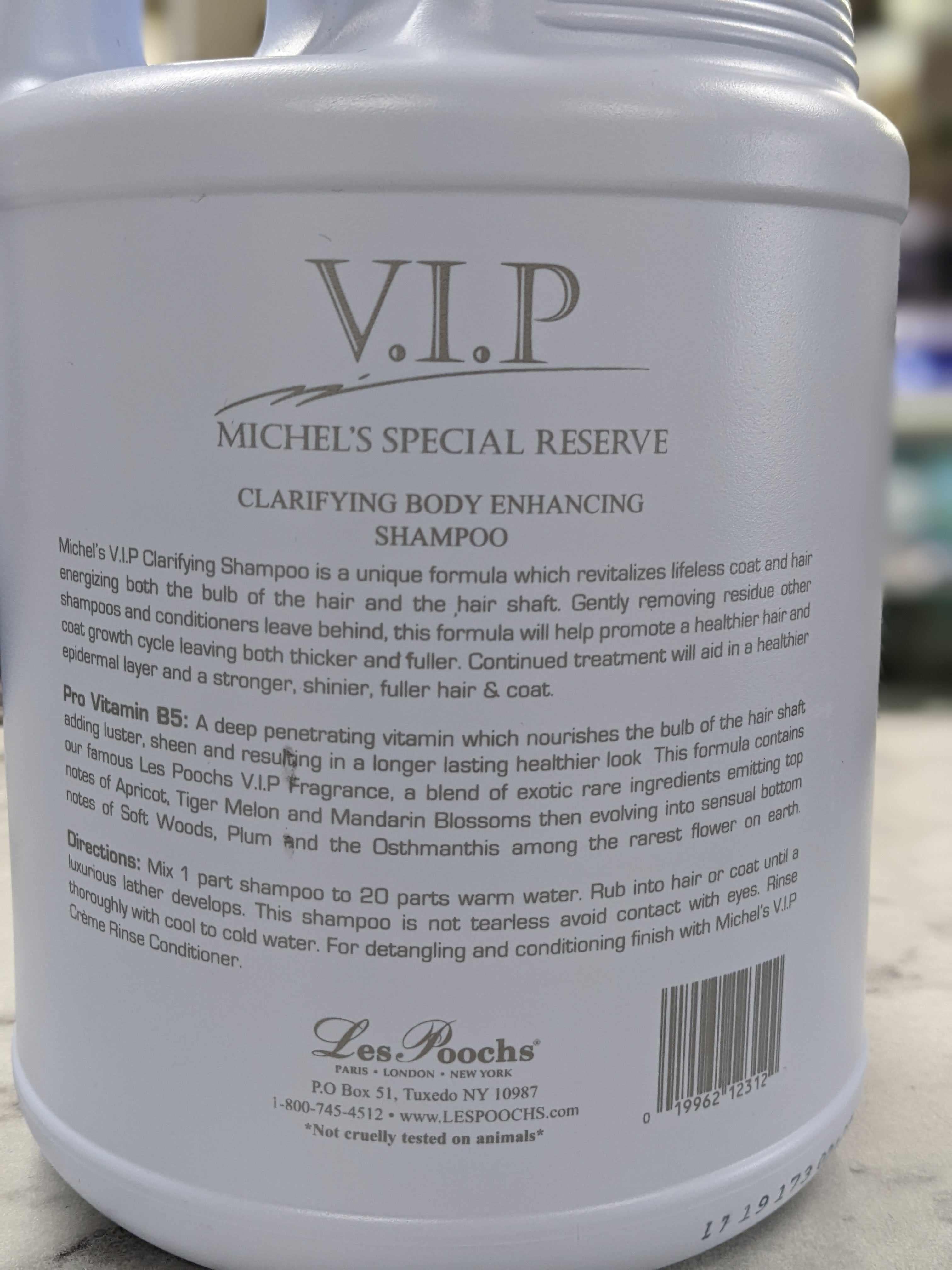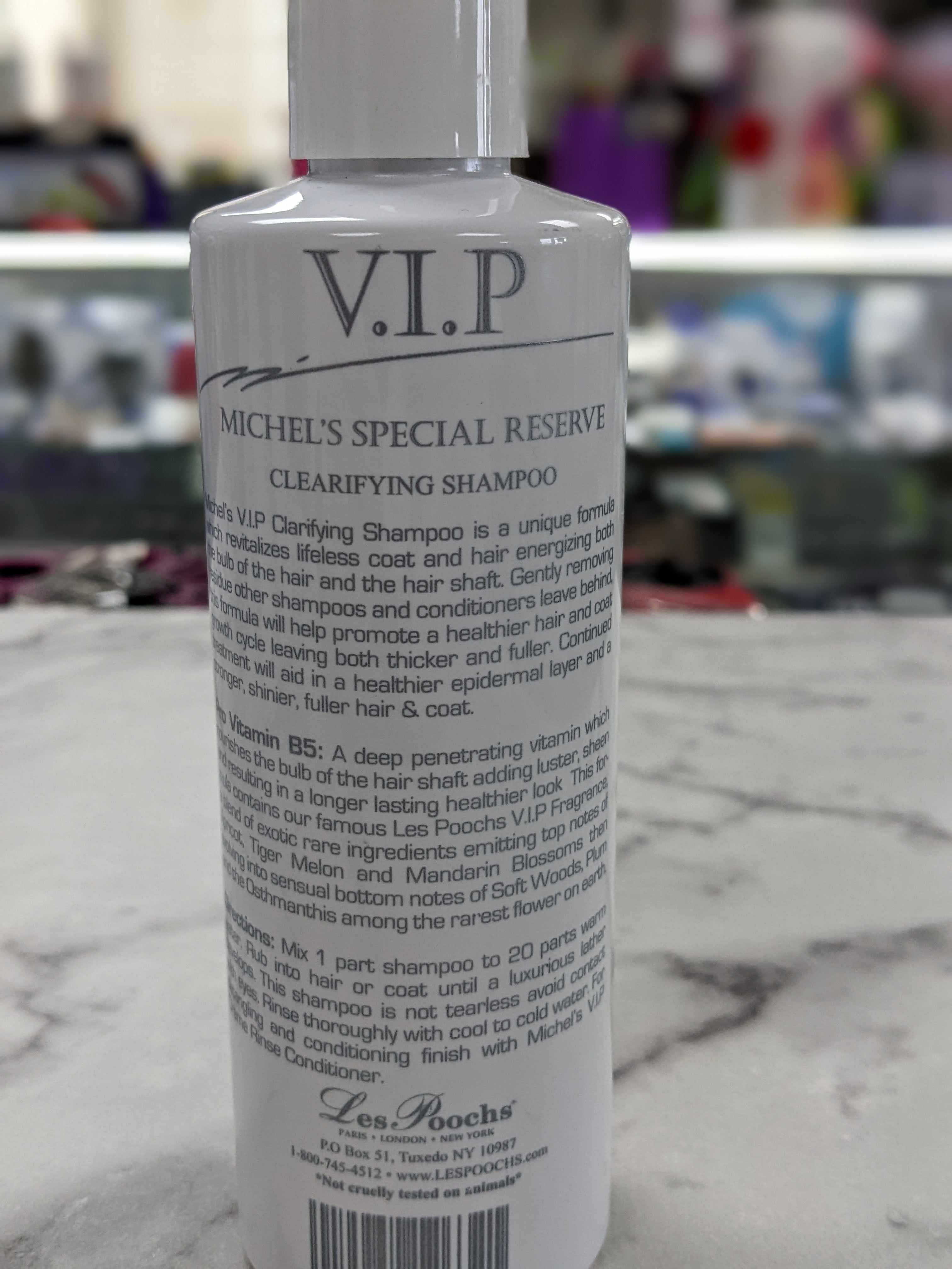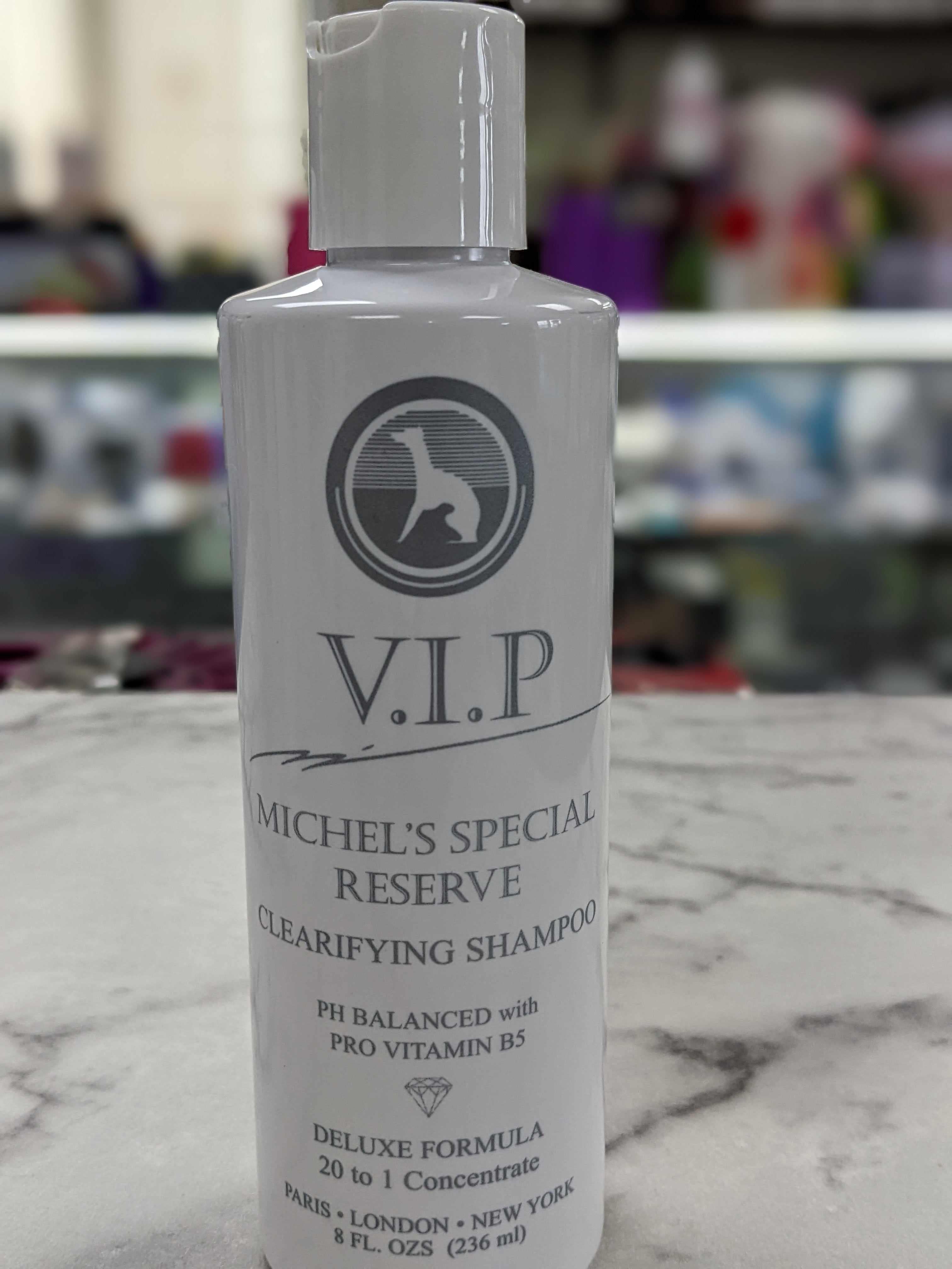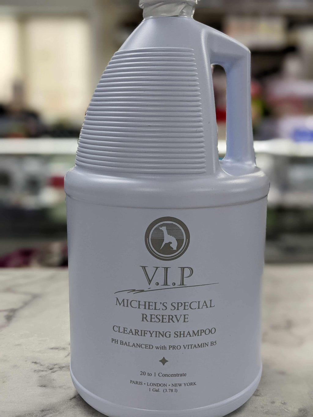 Michael's VIP is a clarifying, meaning it will not only strip off residue left behind by styling products, other shampoos and conditioners, but it also will not weigh down the coat, so if your following with a color dye, this is my choice.