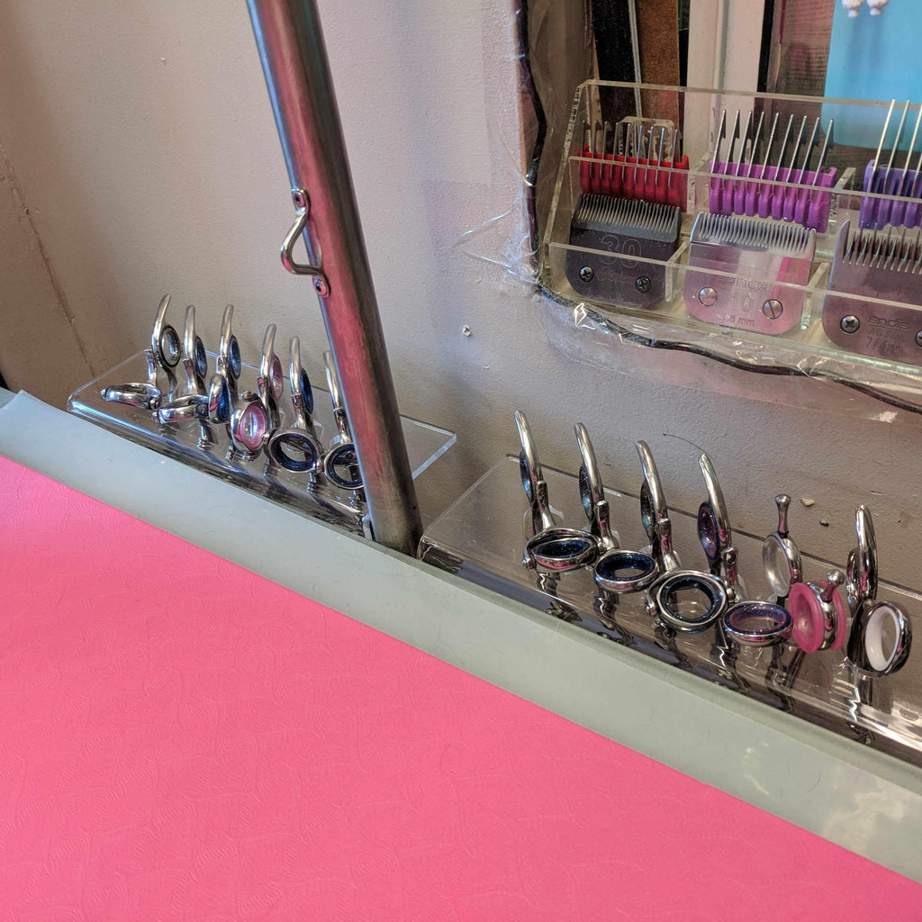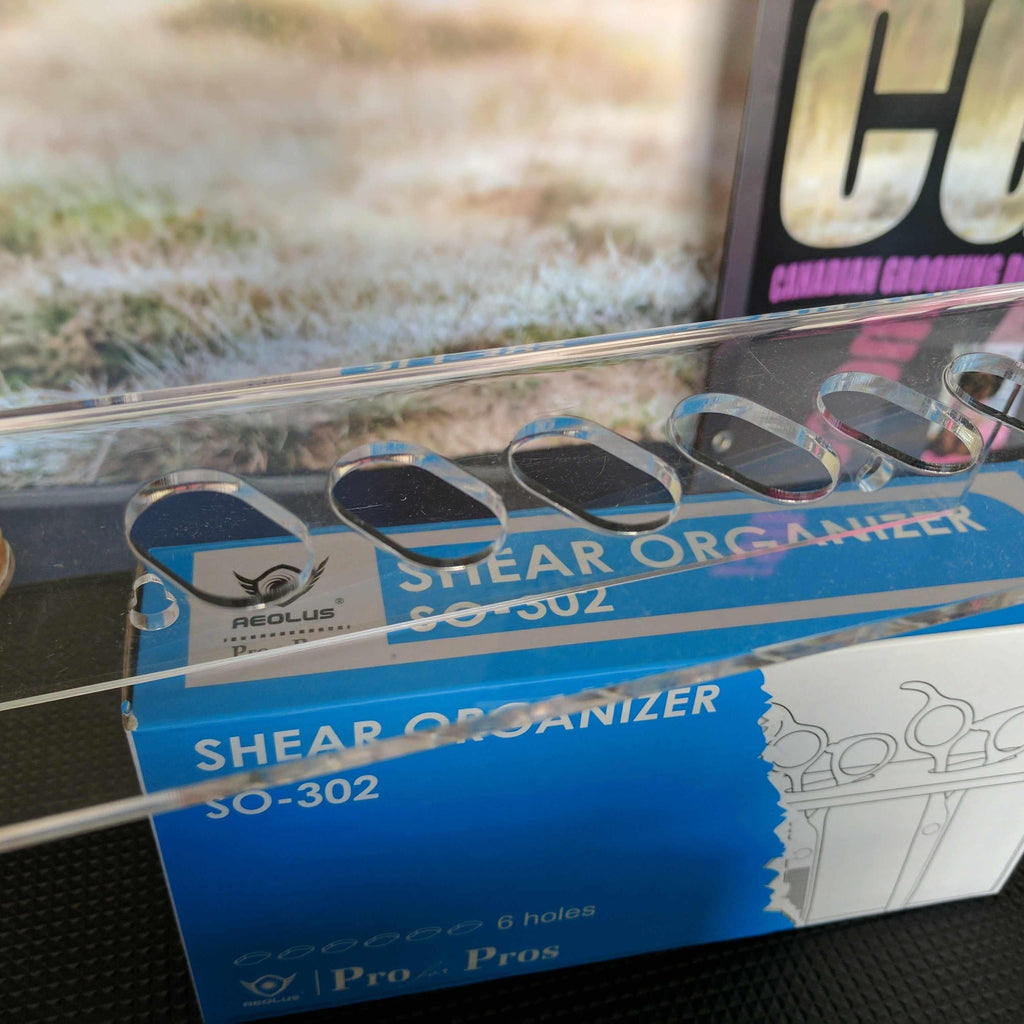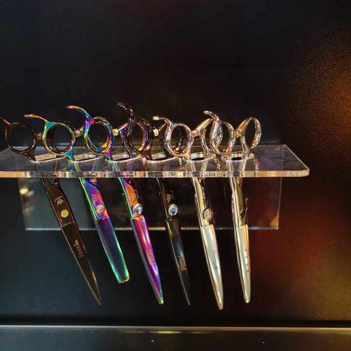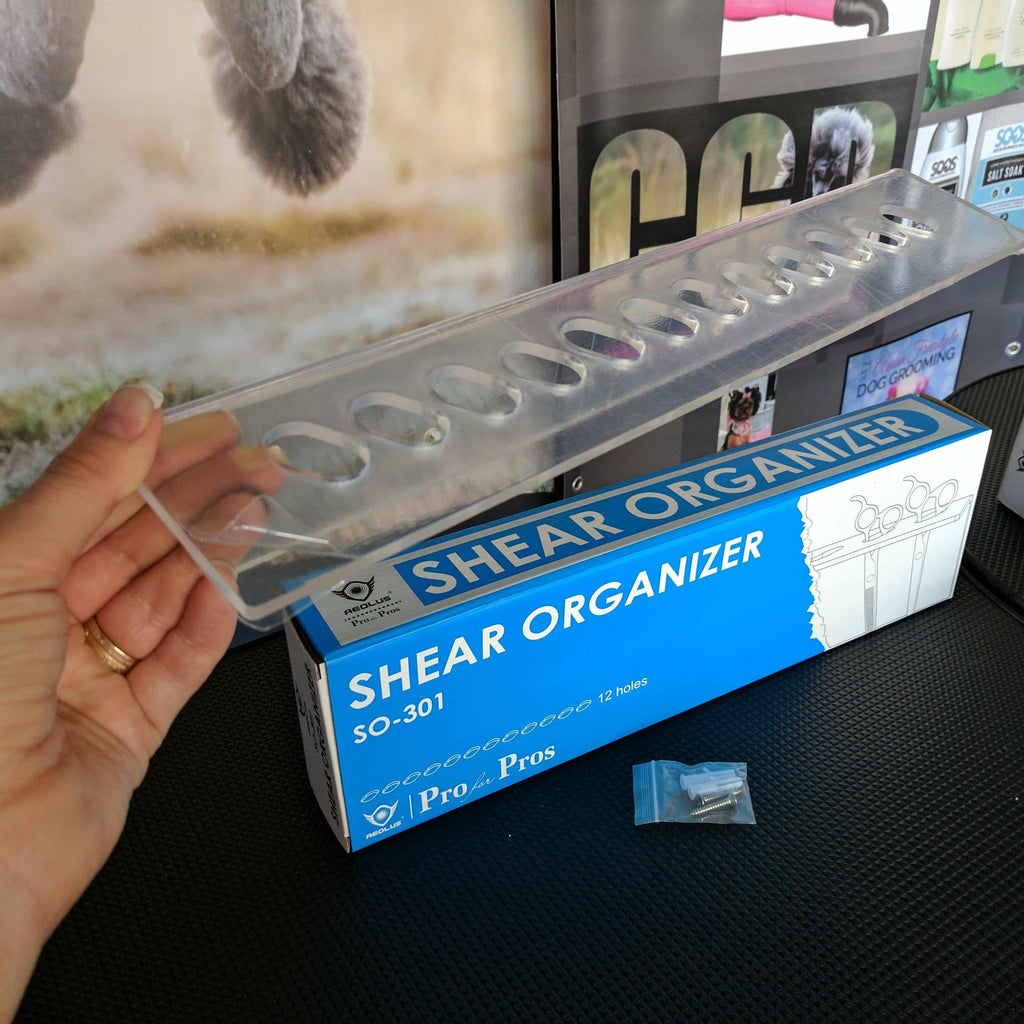 Comes in two styles and sizes. a wall mount(6 or 12 shear) and  a free standing (5 shear)Clear Acrylic Blade Organizer.(you can place in a cubbie or drill hole in bottom and screw down for added stability)
