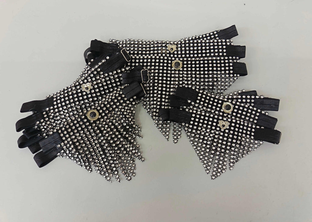 MEDIUM has 1 1/4"-4.5" length of dangle sparkle wrap (7" wide) neck size is 14" at smallest, 21" at largest, (25" stretched) features