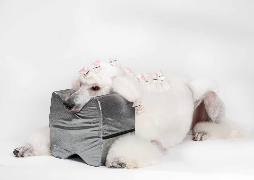 This cushion with a unique shape supports the dog's head. While you are creating the topknot, the dog can comfortably rest its chin on the cushion with his or her head in the same position. A relaxed dog makes the grooming experience a lot more enjoyable for both of you. He or she will be in a relaxed position, and you can work comfortably on the dog.