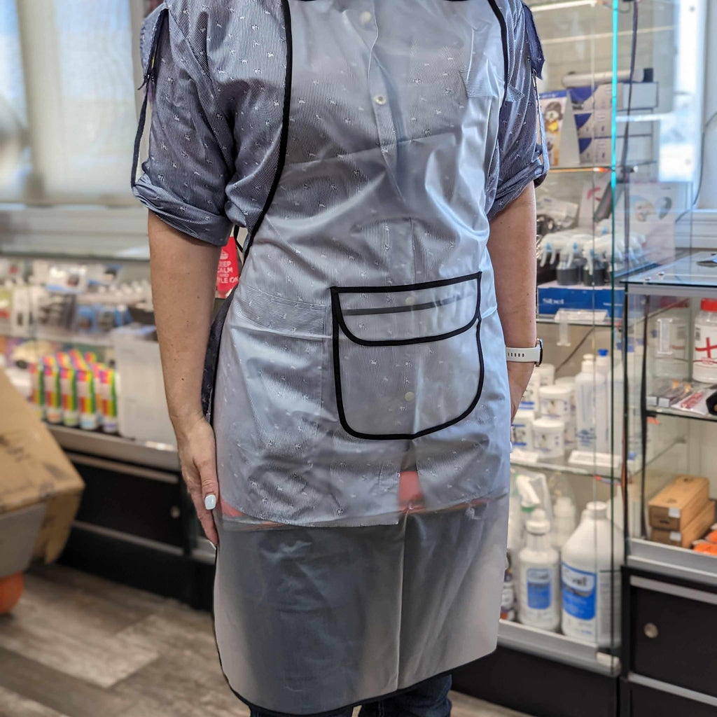 This full length rubbery apron features a shoulder strap style instead of neck strap( no downward pull on your neck all day) and a pocket in the front!